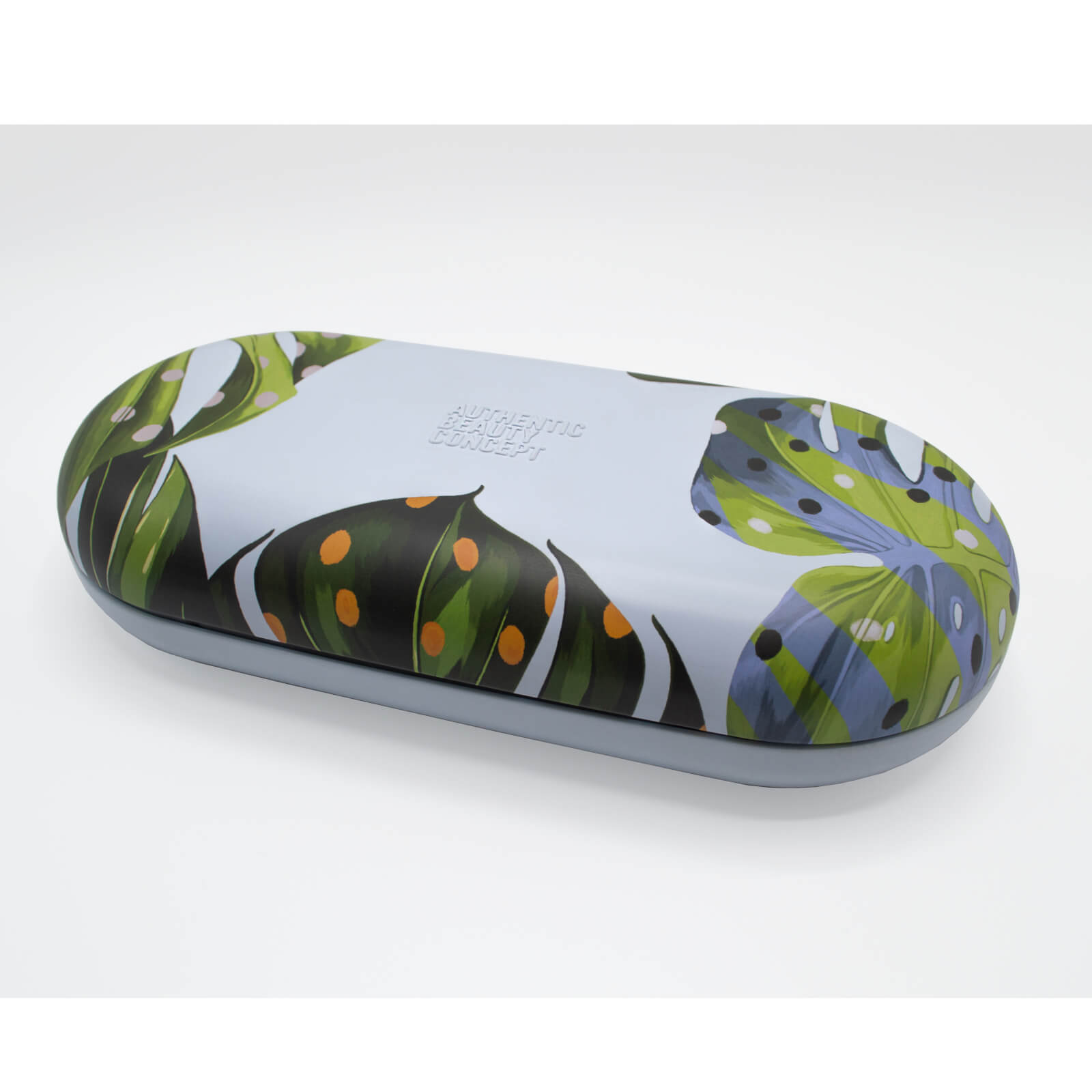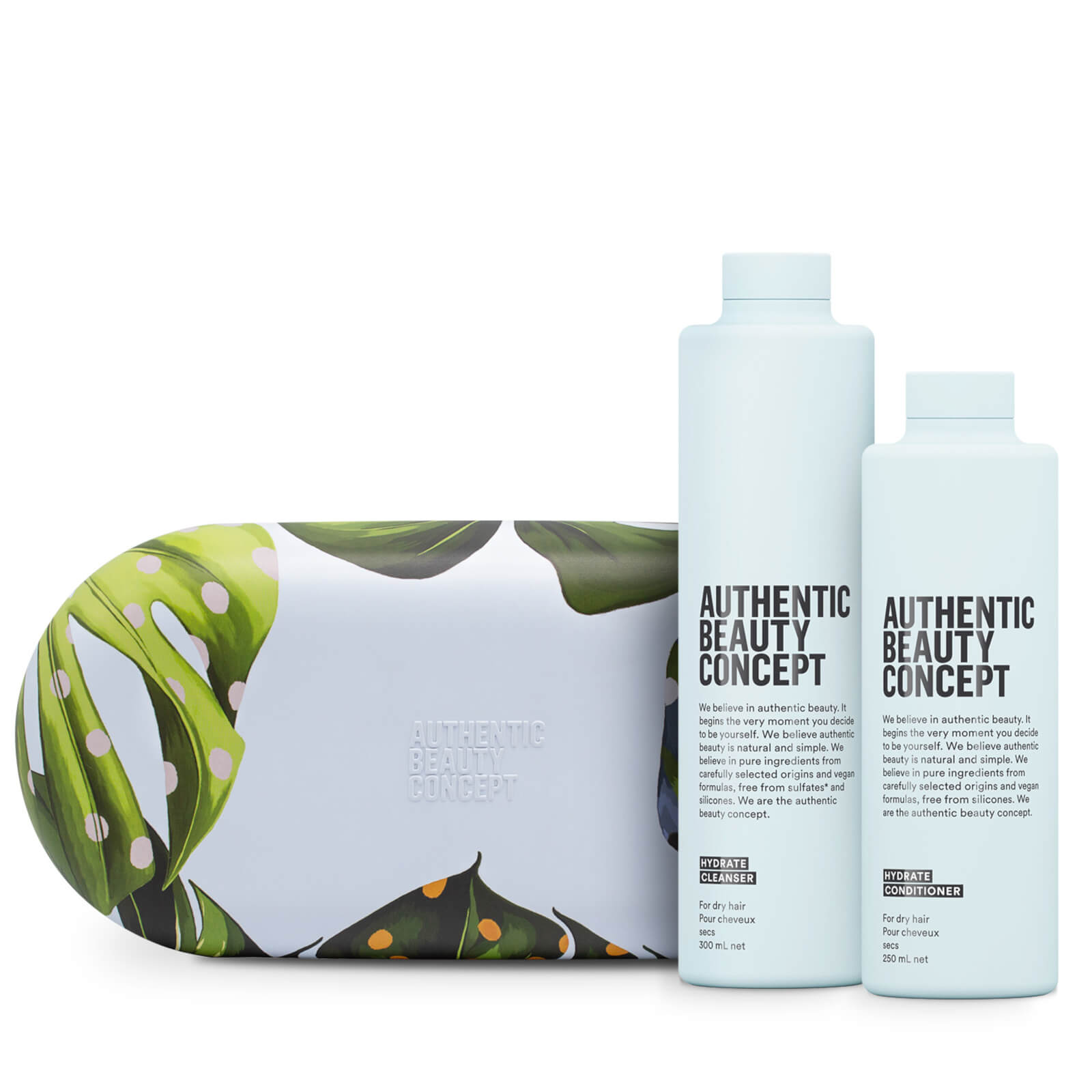 Authentic Beauty Concept Hydrate Gift Set containing Hydrate Cleanser, Conditioner and Scrunchie with matching clutch style gift box created by Barcelona bag design house WOUF. This limited edition collection have a distinctive hand-illustrated botanical pattern on the scrunchie and on the soft touch gift box. The gift box is a reusable metal box perfect for storing items or as a travel box for toiletries.
