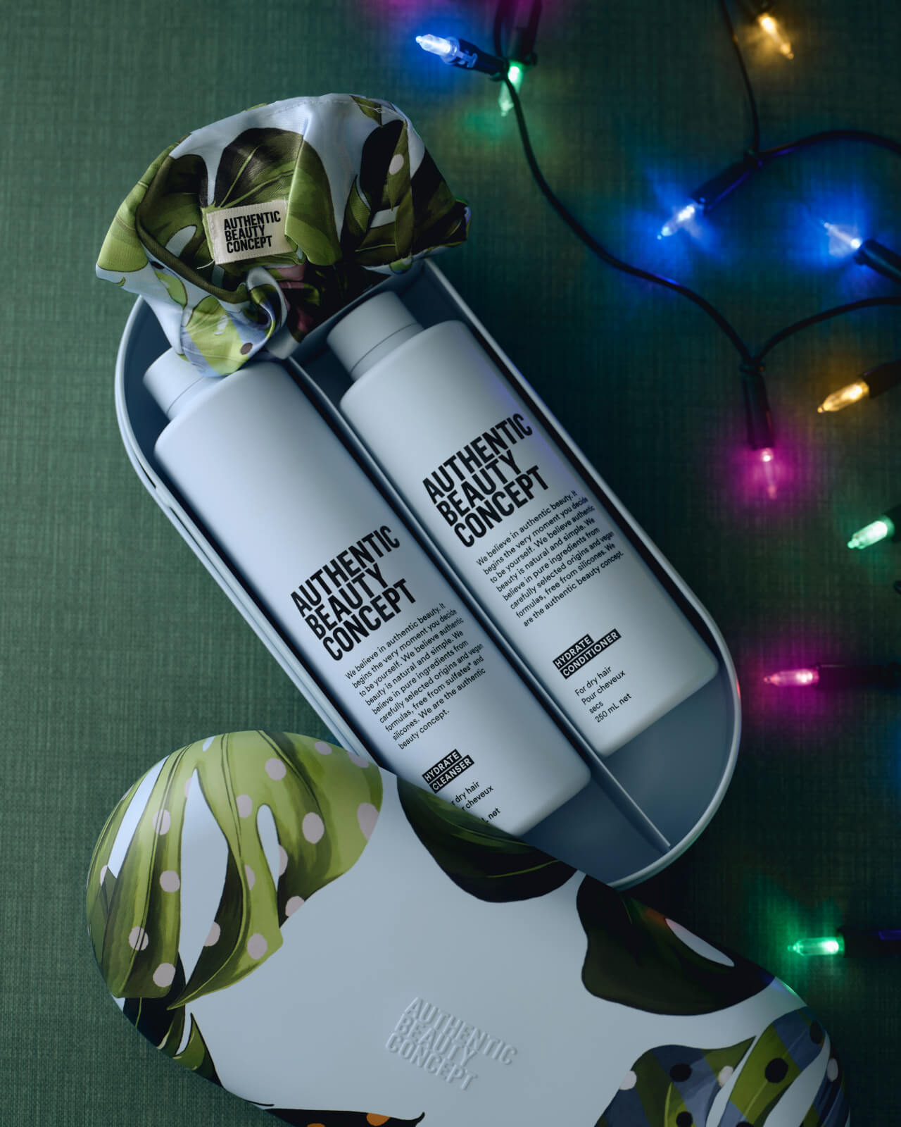 Authentic Beauty Concept Hydrate Gift Set contains the sustainably sourced Hydrate shampoo and conditioner in a stunning reusable gift box designed by the Barcelona bag design company WOUF.  This ethically produced gift set also contains an Authentic Beauty Concept Scrunchie with matching WOUF print design: