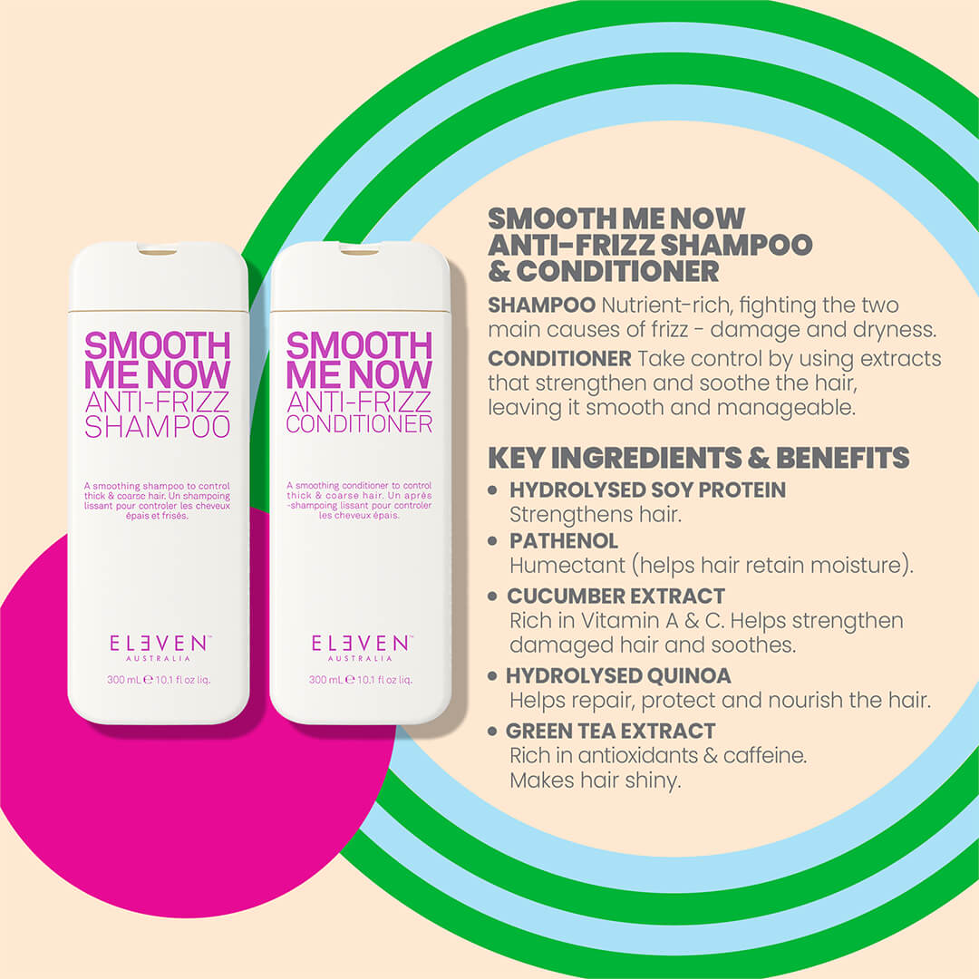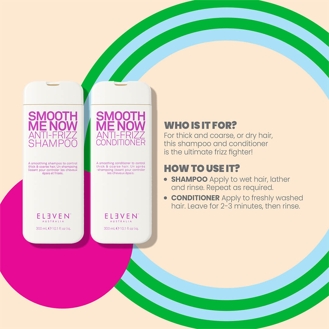 - Follow with Eleven Smooth Me Now Anti-Frizz Conditioner.