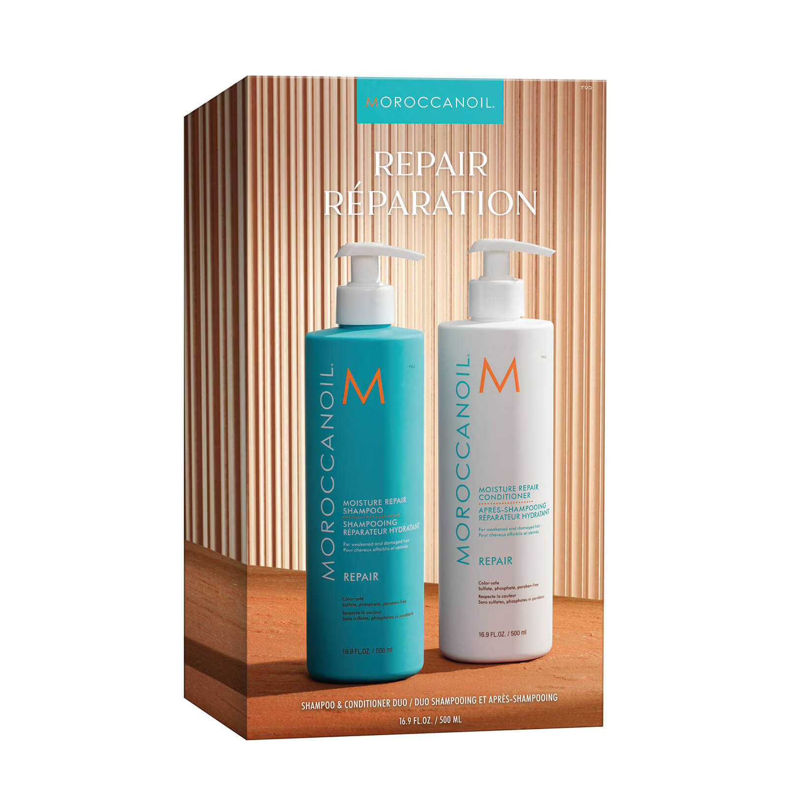 Moroccanoil Moisture Repair Shampoo and Conditioner Supersize 500ml Duo Pack hydrates and repairs hair which is showing signs of damage which could either be a lack of shine, strength, elasticity or split ends. Its gentle cleansing formula is colour safe, sulphate and paraben free.