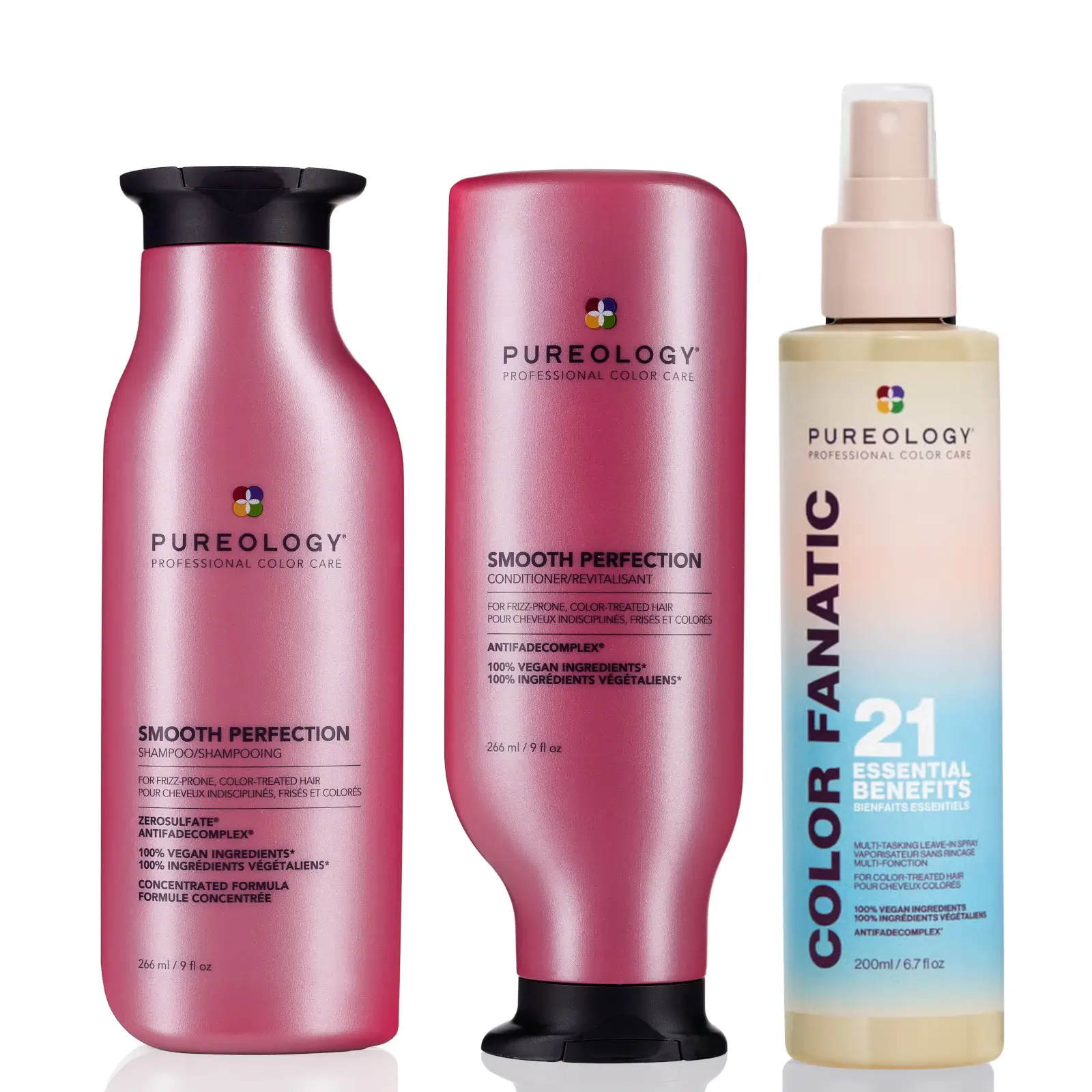 Pureology Smooth Perfection Shampoo, Conditioner & Colour Fanatic Trio Pack is designed for hair that tends to have unwanted frizz. Using Pureology’s Advanced Hydrating Micro-Emulsion Technology the shampoo and conditioner help to smooth frizzy hair and enhance colour vibrancy.